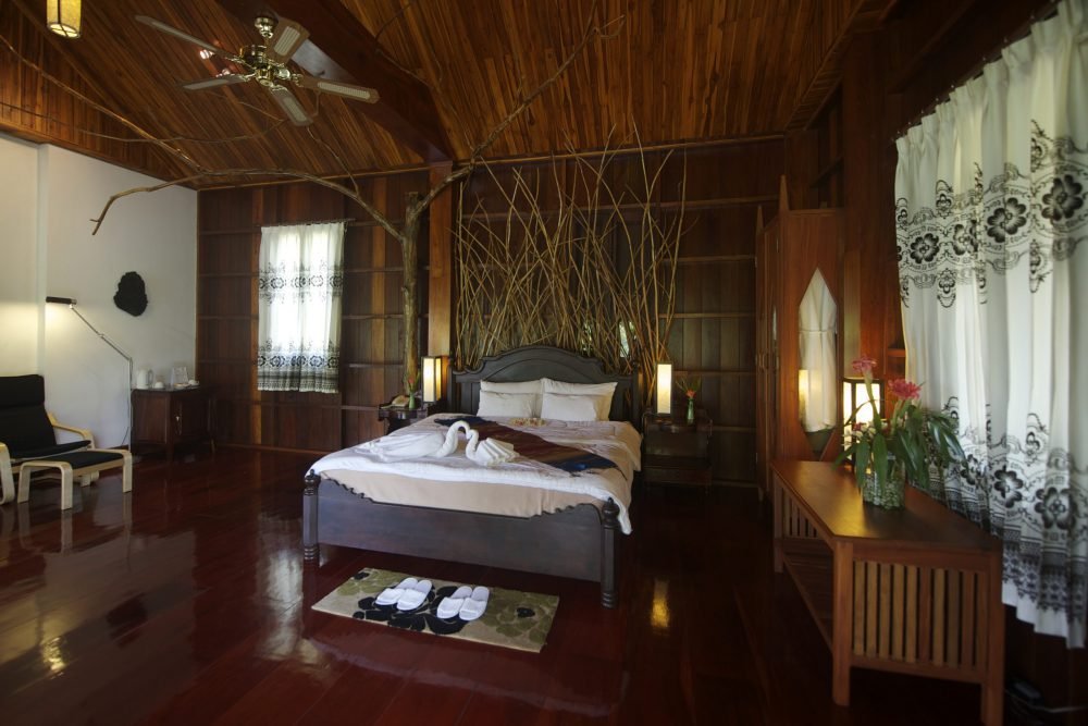 The Executive Suite River View is an independent bungalow on Nam Ou River bank with Luang Prabang architectural design. The bungalow has a large private balcony that boasts views of the Nam Ou River and mountains. The wooden specious room of 91 square meters is well equipped with air-conditioning, ceiling fan, telephone, work desk, mini-bar, sofa, safe-deposit box, free wi-fi in room and a large private bathroom with hot and cold water with jacuzzi bathtub and open sky shower.